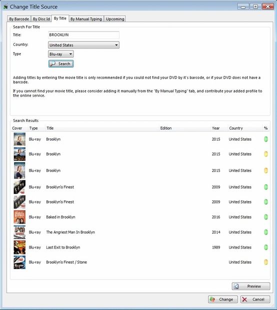 Change title to the correct one, (in this sample to "Brooklyn"), choose Country of origin, Type (BluRay in this sample) and click "Search".